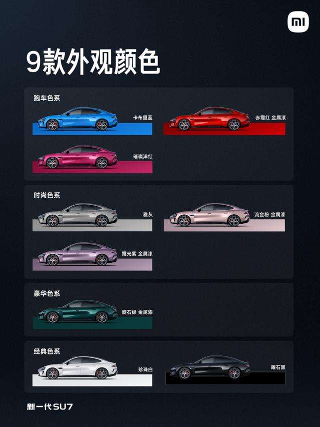 具体配置上,新一代SU7共有9款颜色,其中3款是全新推出,包括卡布里蓝、赤霞红、靛石绿,同时还保留雅灰、珍珠白等4款经典颜色,新一代SU7还有全新进气格栅、105L超大容积前备箱和21寸双层锻造梅花轮毂等设计。