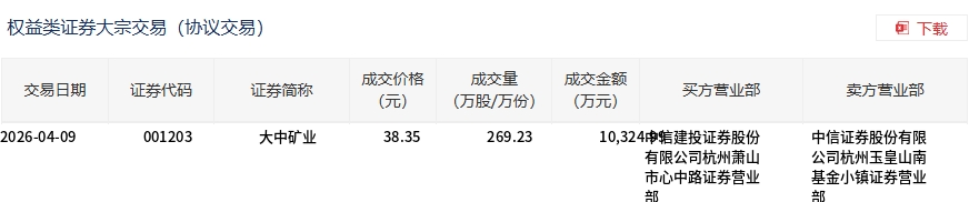 4月9日,大中矿业大宗交易成交269.23万股,成交额1.03亿元,占当日总成交额的8.9%,成交价38.35元,较市场收盘价38.19元溢价0.42%。