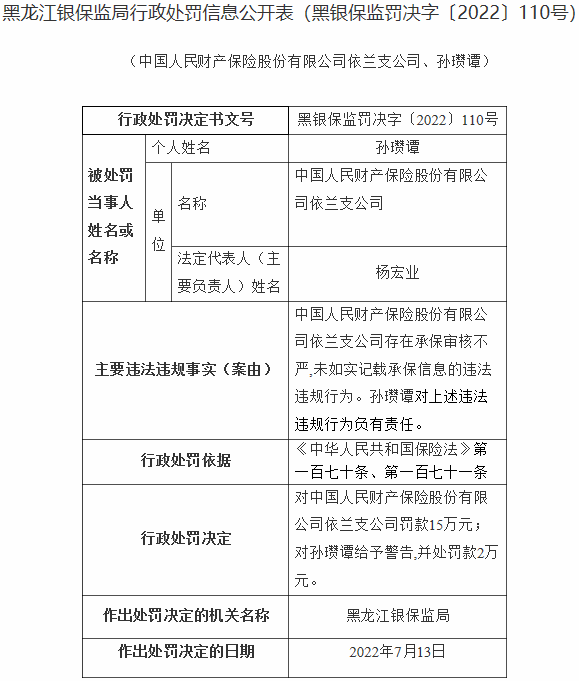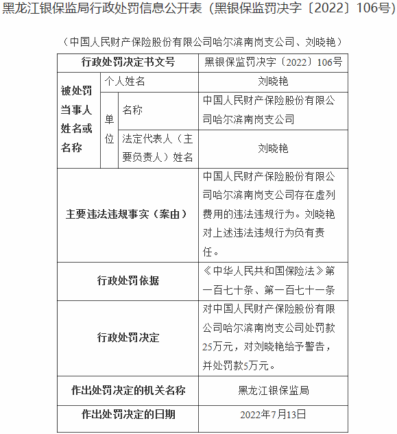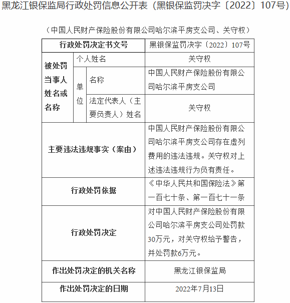 7月21日消息,中国银保监会网站于近日公布的黑龙江银保监局行政处罚信息公开表(黑银保监罚决字〔2022〕106号、107号、109号、110号、111号)显示,中国人民财产保险股份有限公司(以下简称“人保财险”)5家分支公司因存在因虚列费用、承保理赔审核不严等违法违规行为合计被罚120万。