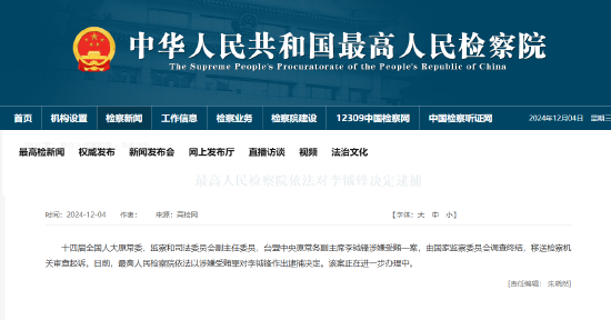 12月4日金融一线消息,据最高检消息,十四届全国人大原常委、监察和司法委员会副主任委员,台盟中央原常务副主席李钺锋涉嫌受贿一案,由国家监察委员会调查终结,移送检察机关审查起诉。日前,最高人民检察院依法以涉嫌受贿罪对李钺锋作出逮捕决定。该案正在进一步办理中。