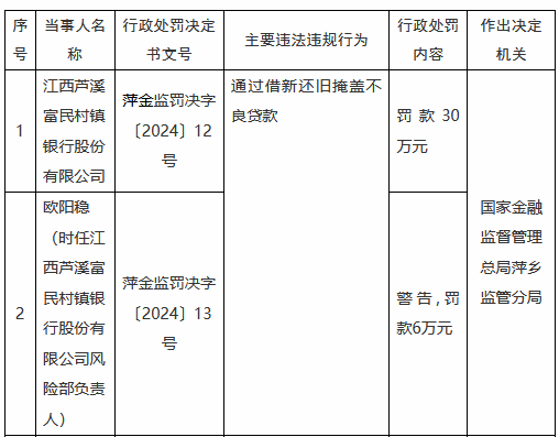12月3日金融一线消息,国家金融监督管理总局萍乡监管分局行政处罚信息公开表显示,江西芦溪富民村镇银行股份有限公司因通过借新还旧掩盖不良贷款被罚款30万元。欧阳稳(时任江西芦溪富民村镇银行股份有限公司风险部负责人)受到警告并被罚款6万元。