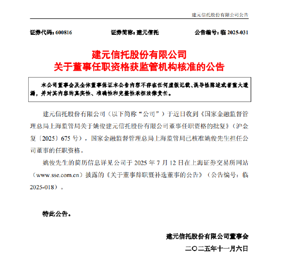 11月5日金融一线消息,建元信托11月5日公告,公司收到《国家金融监督管理总局上海监管局关于姚俊建元信托股份有限公司董事任职资格的批复》,姚俊已获核准担任公司董事。