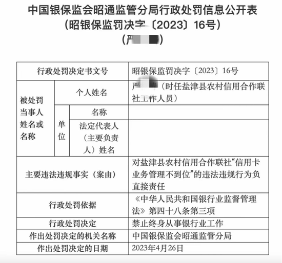 时任盐津县农村信用合作联社工作人员的严某某,因对盐津县农村信用合作联社“信用卡业务管理不到位”的违法违规行为负直接责任,被禁止终身从事银行业工作;时任盐津县农村信用合作联社理事长、监事长均因负直接管理责任遭警告处罚。