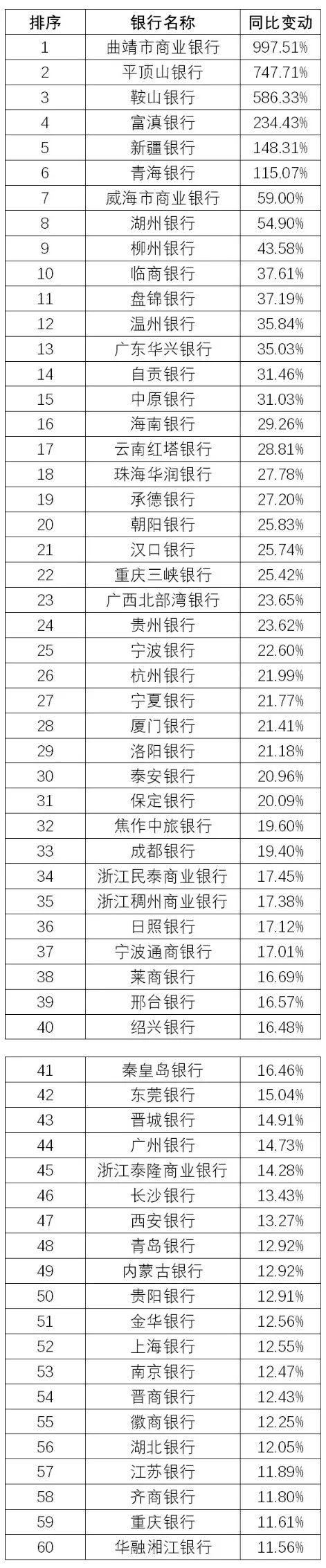 (数据来源:企业预警通APP,北青金融制图)120家城商行2019年归属母公司净利润同比增长排名