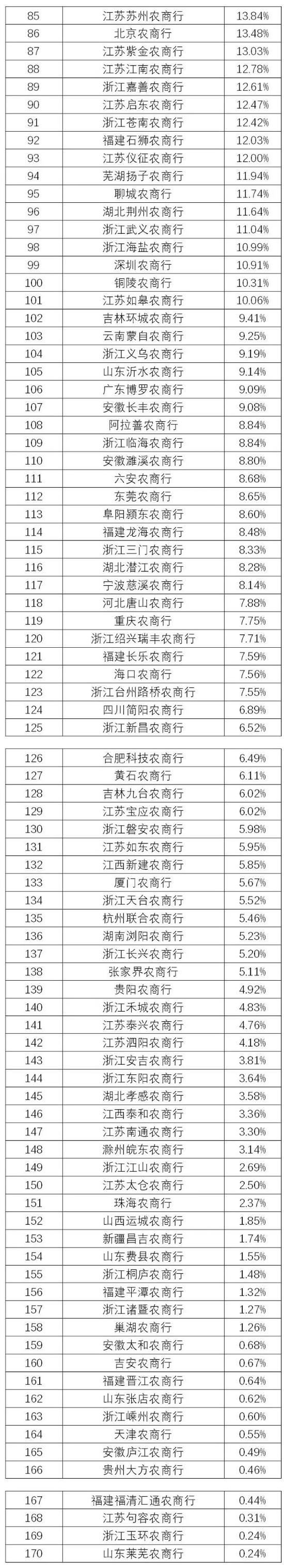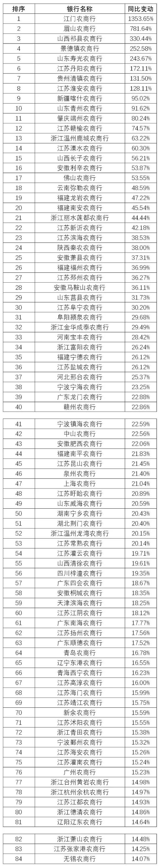 (数据来源:企业预警通APP,北青金融制图)239家农商行2019年归属母公司净利润同比增长排名