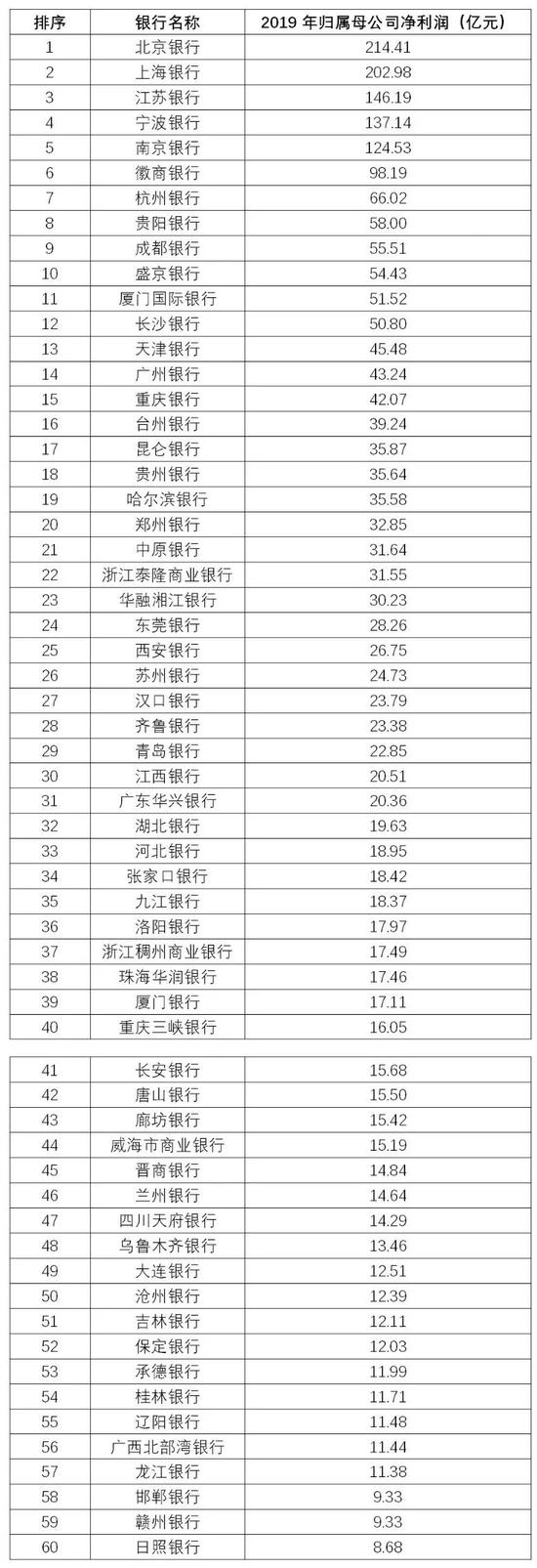 120家城商行2019年归属母公司净利润排名