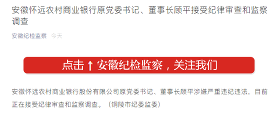 5月28日消息,安徽省纪委省监委官方公众号今日发布消息披露,安徽怀远农商行原党委书记、董事长顾平涉嫌严重违纪违法,目前正在接受纪律审查和监察调查。