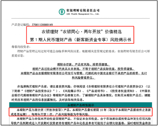 从该只银行理财产品的“风险揭示书”看,该只理财产品为混合类开放净值型产品,理财产品最长期限10 年,即从2020年8月26日至2030 年8月26日,但产品期限取决于理财产品提前终止条款或是否延期,每两年开放1次。