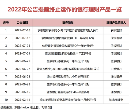 除了农银理财的产品外,今年以来还有盛京银行添益系列一年半定开13期、14期,九个月定开51期;信银理财智慧象固收增强FOF一年定开9号、12号,信银理财固盈象固收稳健半年定开1号;日照银行、浦发银行、渝农商理财等多家银行系机构的理财产品,发布了提前终止的公告,2022年以来累计终止的理财产品数量达到10只。
