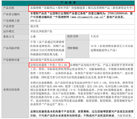 以农银理财“农银同心·两年开放”价值精选第1期人民币理财产品(新客新资金专享)为例,该只产品在投资范围和投资比例上约定:货币市场工具类、债券和其他符合监管要求的债权类资产等固定收益类资产投资比例低于 80%;证券投资基金或各类资产管理产品或计划 0-100%;权益类资产比例低于 50%,其他符合监管要求的资产比例低于 80%。