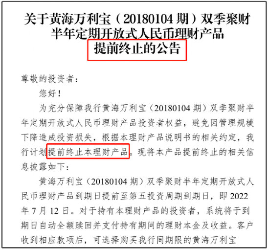 日照银行的黄海万利宝(20180104期)双季聚财半年定期开放式人民币理财产品,还在公告中明示,为充分保障投资者权益,避免因管理规模下降造成投资损失,根据本理财产品说明书的相关约定,该行计划提前终止本理财产品。