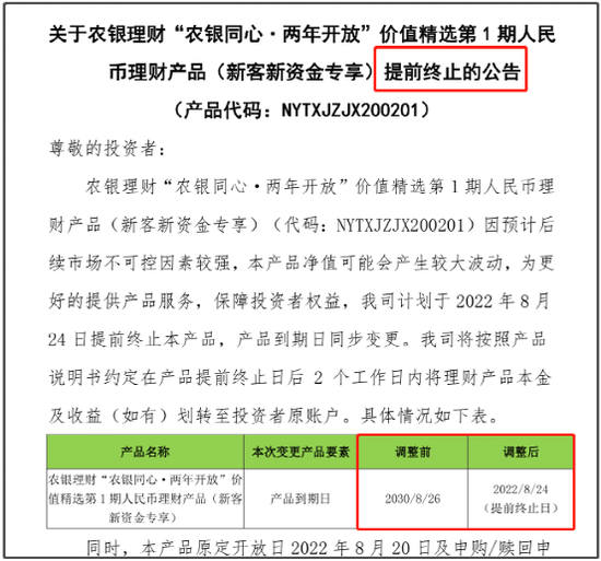7月18日,农业银行旗下理财子公司——农银理财发布公告称,农银理财“农银同心·两年开放”价值精选第1期人民币理财产品(新客新资金专享),因预计后续市场不可控因素较强,该产品净值可能会产生较大波动,为更好提供产品服务,保障投资者权益,公司计划于2022年8月24日提前终止本产品,产品到期日同步变更。