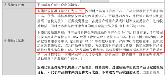 该只产品业绩比较基准(年化)为 4.6%。具体拆解业绩的比较基准,该产品在产品合同中测算:以产品投资现金等高流动性资产仓位5-10%,同业存单、债券等固定收益类资产仓位50%-80%,股票(含优先股)仓位15%-25%,杠杆比例110%为例。业绩比较基准参考中债-综合财富(3-5)年指数收益率、沪深300指数收益率、叠加主动管理超额收益,结合产品投资策略,考虑本理财产品综合费率,确定本理财产品业绩比较基准为年化4.6%。