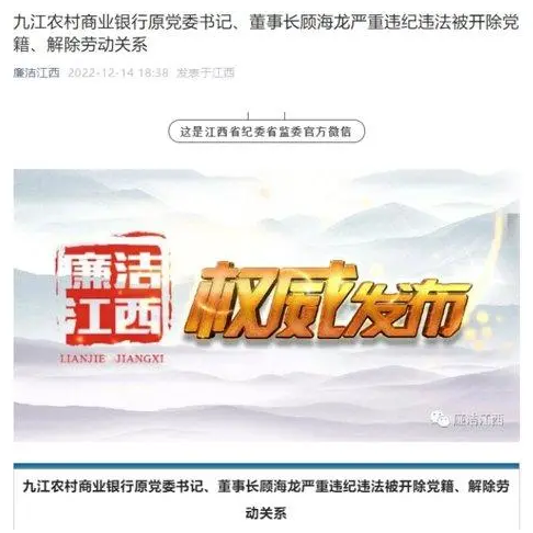 12月14日,经江西省纪委省监委指定管辖,九江市纪委市监委对九江农村商业银行(以下简称“九江农商行”)原党委书记、董事长顾海龙严重违纪违法问题进行了立案审查调查。