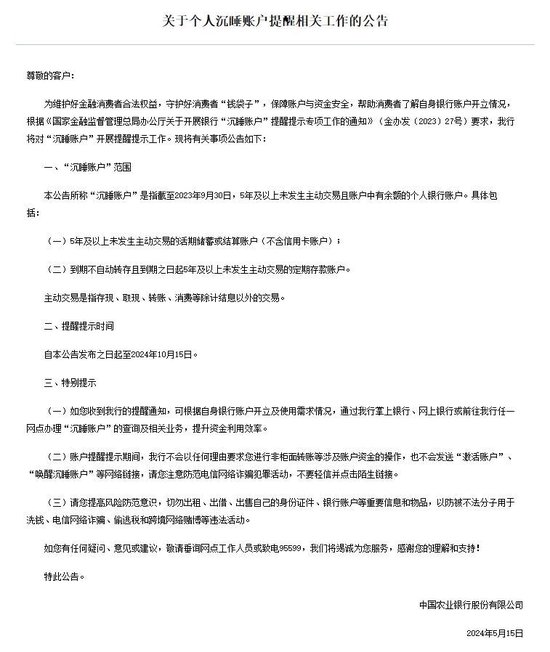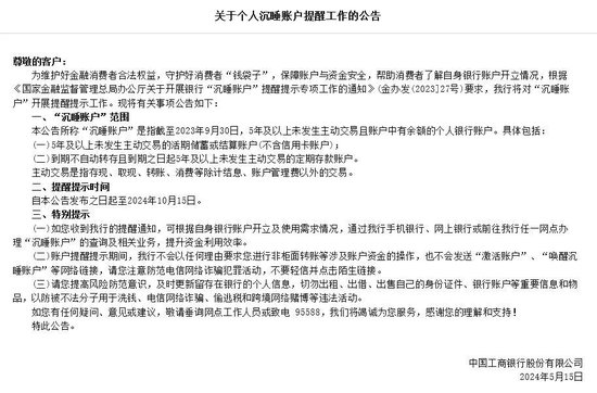 为保障账户与资金安全,帮助消费者了解自身银行账户开立情况,中国工商银行、中国农业银行近期先后发布公告称,将对“沉睡账户”开展提醒提示工作。提醒提示时间自公告发布之日起至2024年10月15日。