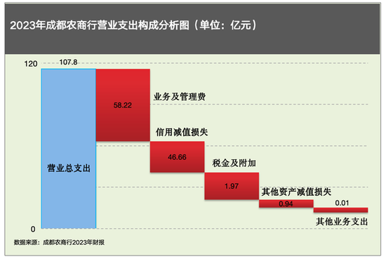 此外,《每日财报》还注意到,成都农商行净利润之所以能在2023年实现超10%的增长,主要是通过减少计提信用减值损失来实现的,要知道去年其营业支出端中所占“大头”的业务管理费是在急剧增长,同比飙升29.69%至58.22亿元,费用率高达33.59%。而彼时信用减值损失却同比缩减了9.43%至46.66亿元。换言之,在业务管理费居高不下且无法得到压降的形势下,如果成都农商行没有通过减少计提信用减值损失来进行调节,其最终净利润可能并不是那么“好看”。