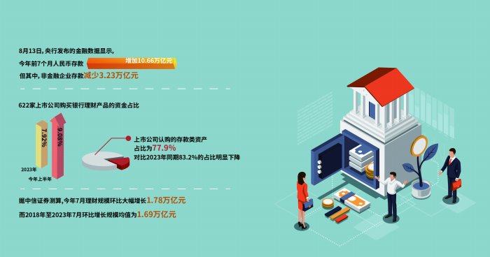一边是企业存款大幅减少,一边是银行理财规模破30万亿元大关。今年前7个月,非金融企业存款减少3.23万亿元,而据中信证券测算,7月末理财规模增长至30.30万亿元。