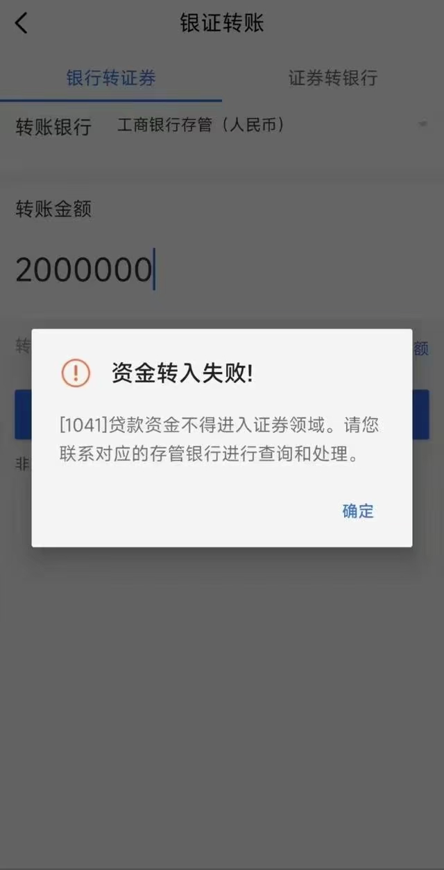 此外,财联社记者还留意到,近日有网传截图显示,有投资者尝试从工商银行转账200万元至证券账户,但在银账转账环节被弹窗提示“资金转入失败!贷款资金不得进入证券领域。请您联系对应的存管银行进行查询和处理。”有券商人士称,这样的提示属于资金报错,是由相关银行反馈过来的。