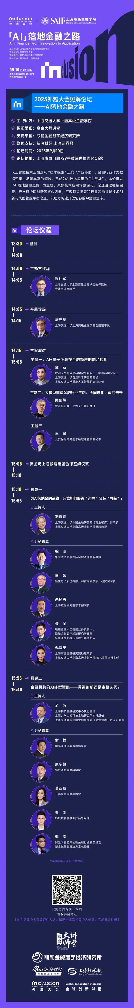 大会期间,上海交通大学上海高级金融学院(高金/SAIF)将承办两场重磅“见解论坛”,邀请全球顶尖学者与行业领袖,共议AI金融生态发展路径与科技金融前沿趋势: