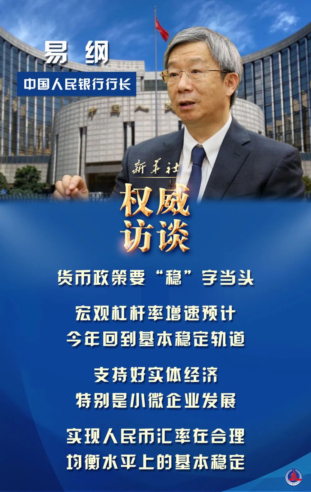 今年我国的货币政策走向如何?怎样持续激发市场主体活力?如何织密金融安全网?中国人民银行行长易纲日前就2021年金融领域热点问题,接受了新华社记者采访。货币政策要“稳”字当头中央经济工作会议提出,宏观政策要保持连续性、稳定性、可持续性。2021年人民银行如何实施好稳健的货币政策,保持对经济恢复的必要支持力度?“2021年货币政策要‘稳’字当头,保持好正常货币政策空间的可持续性。”易纲表示,在总量方面,综合运用各种货币政策工具,保持流动性合理充裕,保持广义货币(M2)和社会融资规模增速同名义经济增速基本匹配。在结构方面,发挥好货币政策工具精准滴灌作用,加大对科技创新、小微企业、绿色发展等重点任务的金融支持。同时,深化利率汇率市场化改革,巩固贷款实际利率下降成果,增强人民币汇率弹性。疫情期间特殊的、阶段性的政策在完成使命后将退出,如何避免政策退出的叠加效应?对此,易纲表示,中国没有采取零利率甚至负利率,也没有实施量化宽松政策,是少数实施正常货币政策的主要经济体之一,一直以来也没有“大水漫灌”。因此,对于中国的货币政策而言,退出问题较小。宏观杠杆率增速预计今年回到基本稳定轨道受疫情影响,2020年上半年我国宏观杠杆率阶段性上升。新的一年,人民银行将如何平衡恢复经济和防范风险?“从宏观上,要稳住宏观杠杆率。”易纲表示,2020年,疫情冲击使GDP增长率较低,使得我国宏观杠杆率,也就是总负债和GDP之比明显上升。去年第三季度以来,宏观杠杆率增速已经放慢,预计今年可以回到基本稳定的轨道。易纲强调,在支持实体经济发展的同时,注意防范金融风险的积累。要稳妥处置个体机构风险和重点领域风险,健全金融风险预防、预警、处置、问责制度体系,进一步压实各方责任,补齐监管制度短板。风险处置过程坚持依法合规、稳妥有序。完善风险处置长效机制,多渠道补充中小银行资本金。加强行为监管,严肃查处违法违规行为。支持好实体经济特别是小微企业发展金融系统始终关注小微企业、个体工商户等市场主体的发展,2020年已实现向实体经济让利1.5万亿元的目标。今年如何提升金融服务的普惠性,更好地支持实体经济、特别是小微企业的发展?易纲表示,金融系统将进一步强化金融有效支持实体经济的体制机制,按照市场化、法治化、国际化原则,健全具有高度适应性、竞争力、普惠型的现代金融体系,完善激励约束机制,设计和创新结构性货币政策工具,继续支持好实体经济特别是小微企业的发展。今年将重点做好四方面工作:——继续实施普惠小微企业贷款延期支持工具和普惠小微企业信用贷款支持计划,两个工具支持力度保持不变。继续运用普惠性再贷款再贴现政策,引导金融机构加大对“三农”、小微和民营企业等领域的支持力度。——持续开展商业银行中小微企业金融服务能力提升工程,支持商业银行扩大“三农”、小微企业、制造业贷款投放。鼓励银行综合评价小微企业信用风险水平,降低对抵押担保的依赖。——继续发挥民营企业债券融资支持工具引领作用,支持银行发行小微专项金融债券,推广供应链票据和应收账款确权,促进企业发债融资。引导市场推出更多供应链金融产品,支持产业链上下游小微企业融资。——健全农村金融服务体系。做好巩固拓展脱贫攻坚成果同乡村振兴有效衔接金融服务,保持对脱贫地区金融帮扶政策总体稳定。加大对种业发展等农业重点领域的信贷投放。拓宽农业农村抵质押物范围,优化风险评估机制,支持符合条件的主体通过股权、债券等直接融资。继续深化利率汇率市场化改革存量浮动利率贷款定价基准转换已在2020年顺利完成,近期人民币汇率走势也引起了较多关注。2021年,利率和汇率市场化改革还将推出哪些举措?易纲介绍,2021年人民银行将进一步疏通LPR向贷款利率的传导渠道,通过深化LPR改革推动存款利率的逐步市场化。加强对互联网平台存款和异地存款的管理,维护存款市场秩序,稳定银行负债成本。进一步健全央行政策利率体系和货币市场基准利率。“2020年人民币汇率弹性增强,较好地起到了宏观经济和国际收支自动稳定器的作用,提高了货币政策自主性。”易纲认为,去年人民币汇率有所升值,主要是中国经济基本面的反映。中国率先控制住疫情、率先复工复产、率先实现经济正增长,基本面好于其他主要经济体。同时,人民币汇率呈现较强走势也和美元指数走弱有关。易纲表示,2021年将继续坚持市场在人民币汇率形成中发挥决定性作用,优化金融资源配置。坚持有管理的浮动汇率制度。注重预期引导。实现人民币汇率在合理均衡水平上的基本稳定。继续推动金融高水平对外开放过去一年,中国金融市场对外开放的节奏未被疫情打乱,惠誉成为第二家进入中国的国际评级公司、中国债券纳入富时罗素指数有了明确时间表……下阶段,人民银行将如何继续推动金融高水平对外开放?“金融业开放是构建新发展格局的必然要求。”易纲表示,下一步,全面实施准入前国民待遇加负面清单管理制度,切实转变开放理念,推动系统化、制度化开放。进一步完善金融领域各项配套制度,促进监管模式和制度体系与国际通行规则接轨。统筹推进金融业开放、人民币汇率形成机制改革和人民币国际化。扩大开放之后,相应