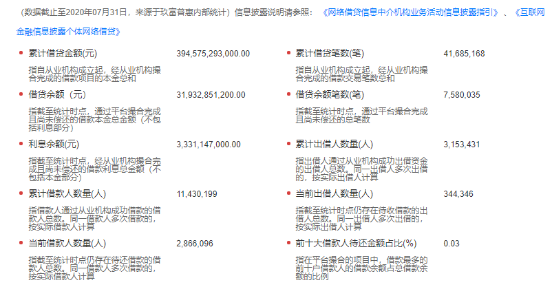 玖富普惠网站公布的运营数据显示,截至2020年7月31日,累计借贷金额3945.75亿元,借贷余额319.33亿元,利息余额33.31亿元;累计出借人3153431人,当前出借人344346人;累计借款人11430199人,当前借款人2866096人。