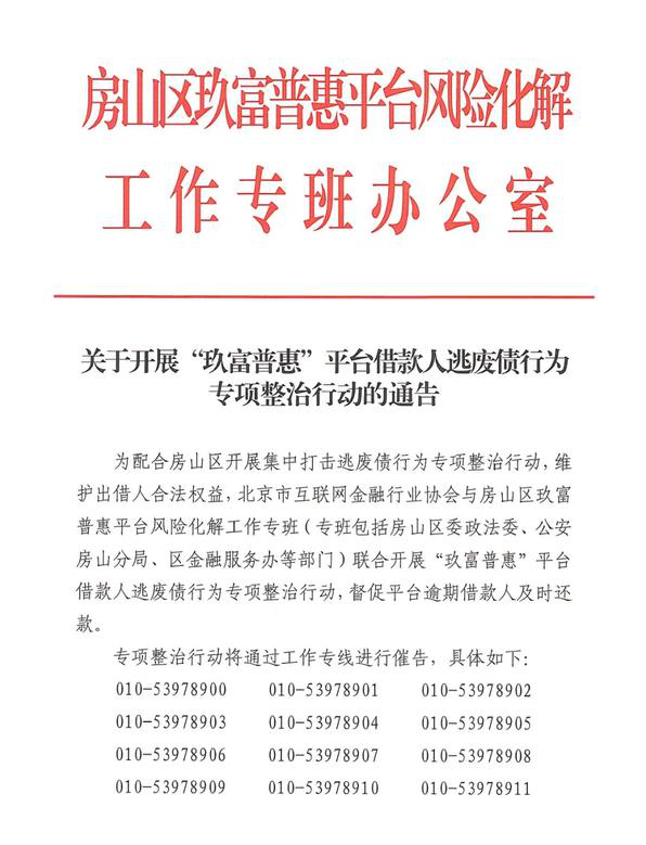 与此同时,房山区玖富普惠平台风险化解处置专班同步开展”玖富普惠“平台借款人逃废债行为专项整治行动。通告强调,“玖富普惠”平台各借款人,应主动履行还款义务,及时归还借款本息,经催告后仍拒绝还款的,专班将会同各成员单位进一步采取失信惩戒措施。