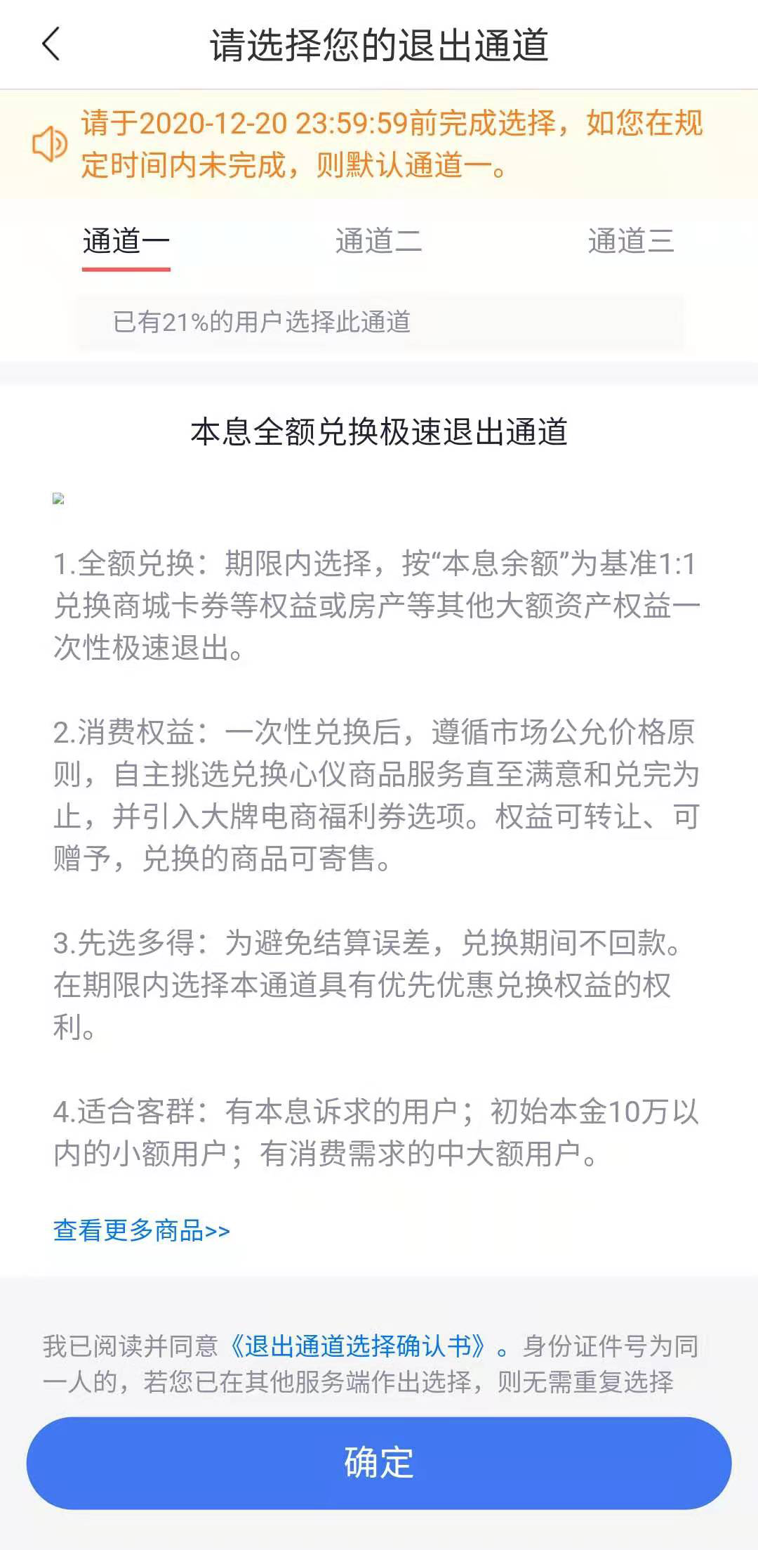 第一种通道是本息全额兑换极速退出通道。