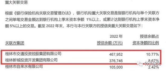 如图,截至2022年底,桂林银行第一大股东、该行实控人桂林交通投资控股集团有限公司和第四大股东桂林新城投资开发集团有限公司合计从桂林银行获得授信达84亿元以上,合计授信余额占桂林银行资本净额的比例已高达19.44%。两大股东如此之高的授信占比,显然对桂林银行的内控风险形成潜在威胁。