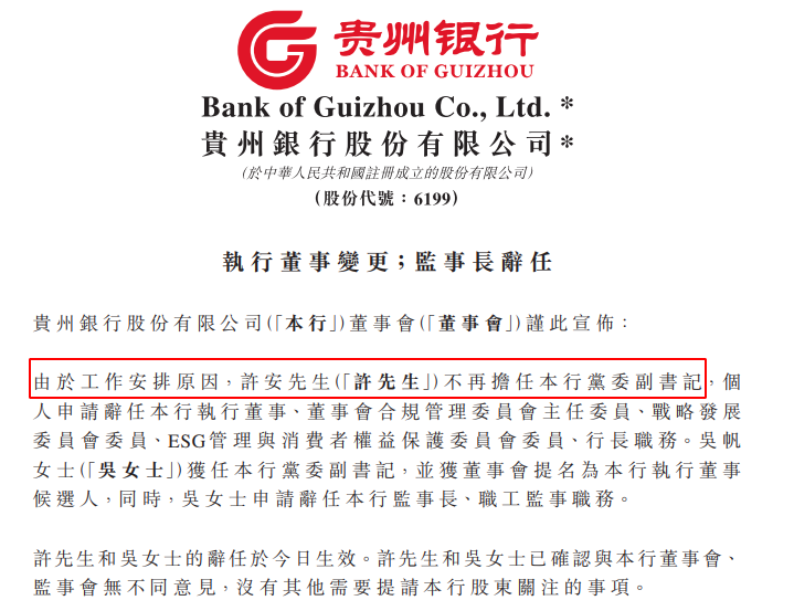虽然公告称许安系“工作安排”原因辞职,但贵州银行公告中并未按照行业惯例对许安任职期间贡献予以感谢,这也引起了市场的相关猜测。