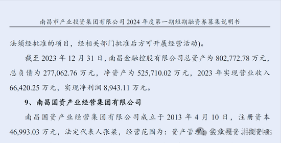 据南昌产投融券募集说明书披露,截至2023年末,南昌金控总资产为80.28亿元, 总负债为 27.71亿元,净资产为 52.57亿元,2023年实现营业收入6.64亿元,实现净利润8943.11万元。