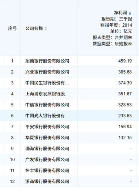 2014年三季报,招商银行净利润为459.19亿元,排名股份制银行第一,民生银行为347.3亿元,排名股份制银行第三,民生银行和第二名兴业银行的差距只有10亿元。