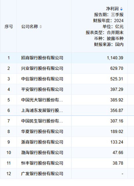 2024年三季度股份制银行净利润