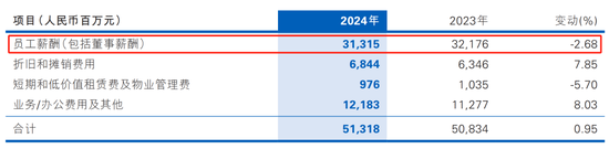 支出上,2024年民生银行业务及管理费513.18亿元,同比增加4.84亿元,增幅0.95%。其中,员工薪酬(包括董事薪酬)313.15亿元,比上年减少8.61亿元,同比下降2.68%。
