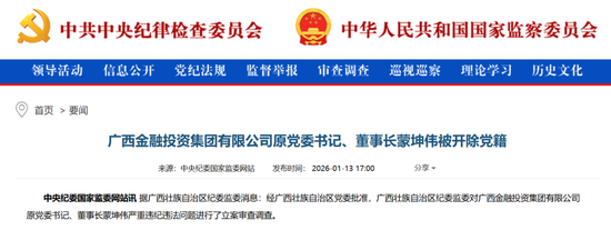 1月13日,中央纪委国家监委官网通报:广西金融投资集团有限公司原党委书记、董事长蒙坤伟被开除党籍。