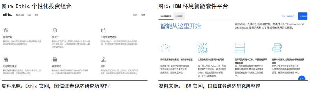 AI技术的出现为投资组合优化带来了革命性的变化,使得从标准化到个性化的转变成为可能。例如,Ethic使用AI技术为投资者创建个性化的可持续性投资组合,根据投资者的偏好和目标,提供量身定制的投资解决方案,以实现财务回报与环境及社会责任的平衡。Ethic和Ellevest合作开发了一种新的投资方式,旨在解决性别不平等、种族不公和气候变化等问题对女性,特别是有色人种女性的不成比例的影响。Ellevest通过发展其影响力投资组合,将种族正义纳入其中,从而赋予客户更大的投资自主权。IBM环境智能套件是一款AI驱动的SaaS解决方案,它结合了气候变化的地理空间数据,为企业在可持续金融和投资决策方面提供关键洞察,帮助企业考虑到气候相关的风险和机遇。