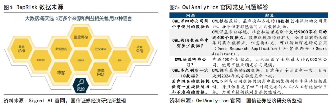 这些AI技术的应用显著提升了ESG数据处理的效率和质量,并且支持动态更新。例如,RepRisk可以做到每日更新数据库。AI技术不仅减少了人为偏见,还增强了数据的透明性。例如,OwlAnalytics公开数据来源和验证逻辑,确保数据的可信度。通过这些技术,投资者和资产管理机构能够更有效地进行ESG投资决策,提前识别和应对潜在的ESG风险,实现可持续发展的目标。WisdomTree资产管理公司的产品开发与管理负责人Ben Wallach评价,“WisdomTree在其ESG(环境、社会和治理)投资流程中利用OWL的数据,旨在提供真正有影响力和可持续的ESG ETF。OWL提供的基于动态共识的公司评级方法,提供了一种客观性,这可以在这一快速变化的领域中成为真正的差异化因素。”基金经理Shoichiro Aoyama对OWL的评价,“OWL基于大数据的共识评级和基础洞察能够提升我们的ESG投资解决方案和ESG研究”。