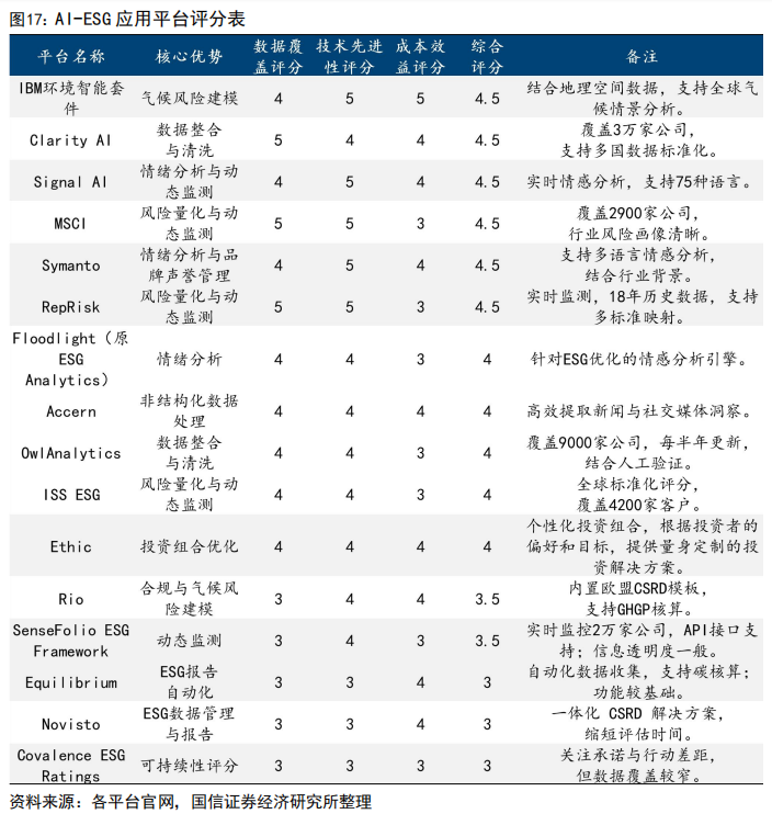 按照平台的优势功能进行分类,本文对主流的16家AI-ESG应用平台进行主观评分,并综合考虑了数据覆盖、技术先进性、成本效益等关键指标,评分范围为1-5分,其中5分为最优。