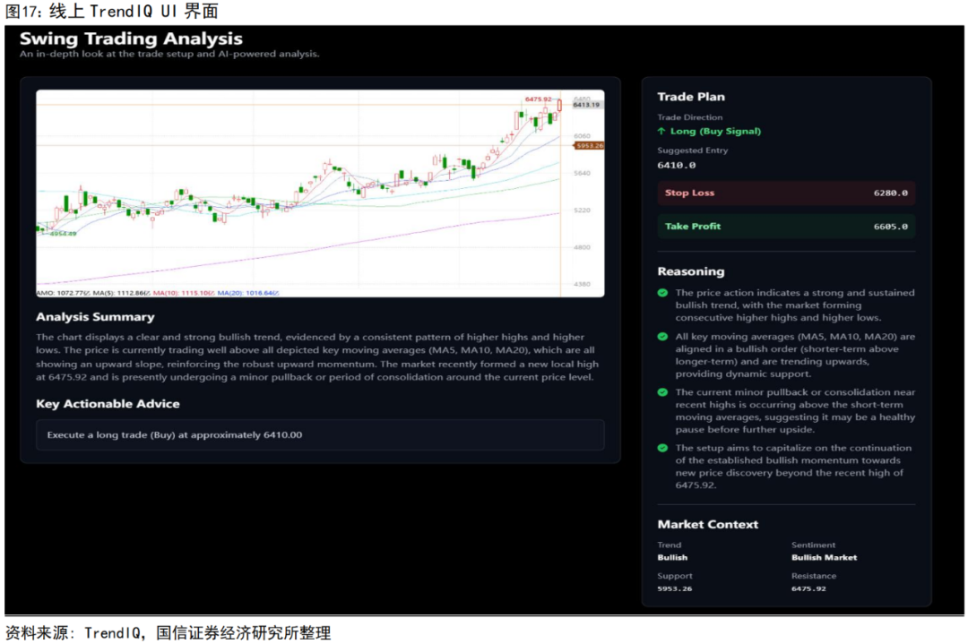 预测结果分为三个部分:1)可能的趋势研判:给出多空判断;2)止盈止损位置:在多空判断的基础上,进一步给出止盈和止损的区间,以下图为例,下图中TrendIQ预测仍是做多环境后,结合当前6410的价格,给出了6685的止盈线和6280的止损线;3)具体理由:以图中的案例为例,AI预测指数继续向上的4个理由包括①上涨趋势建立,支撑位抬升;②均线多头排列;③目前在近期高点附近的小幅回调或盘整发生在短期均线上方,表明这可能是进一步上涨前的一次健康回调;