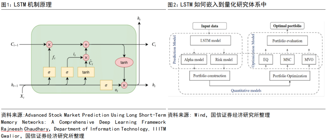 过往学界与工业界倾向于使用LSTM作为价格预测的基础模型。这一模型选择背后主要有2个核心原因:一是于股价预测是高度非线性的,这就要求模型能够处理非线性问题;二是股价本身具有时间序列的特性,适合使用循环神经网络。因此相比于众多ML和DL模型,LSTM在这个问题上有着天然的优势。LSTM模型的1个神经元包含了1个细胞状态(cell)和3个门(gate)机制,三个门分别是输入门、遗忘门和输出门:1)输入门决定将哪些新信息添加到细胞状态;2)遗忘门负责单元状态的权重和激活函数;3)输出门决定输出什么,即隐藏状态的值。