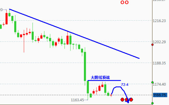 今日方面,当日线报收于十字K的时候,价格收盘长期在1168一线横盘,今日再度做空没有什么悬念,而这个做空的强弱,应该在早间。一方面看十字续跌,这就意味着昨日高点1175一线成了关键阻力位。另一方面,经历了连续横盘,早间能否下跌,同样关系到区间。