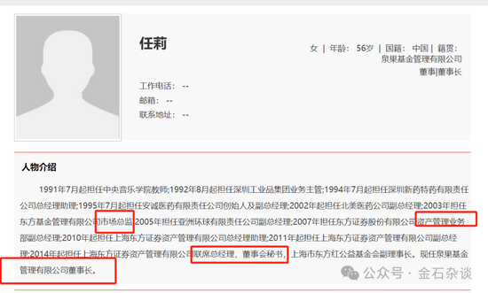 根据公开资料,任莉拥有十多年海内外市场营销经验,她在东方红资管长达15年。她曾任东方证券资产管理业务总部副总经理,上海东方证券资产管理有限公司总经理助理、副总经理、联席总经理、董事会秘书。