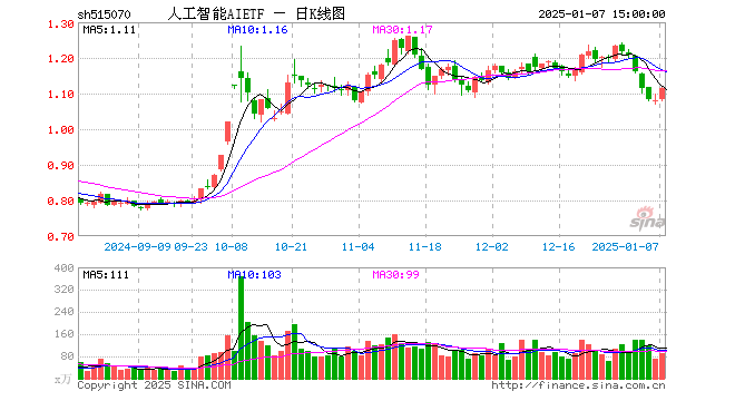 1月7日,人工智能AIETF(515070)涨3.24%,成交额9827.21万元。当日份额减少1050.00万份,最新份额为26.55亿份,近20个交易日份额增加1.70亿份。最新资产净值计算值为29.62亿元。