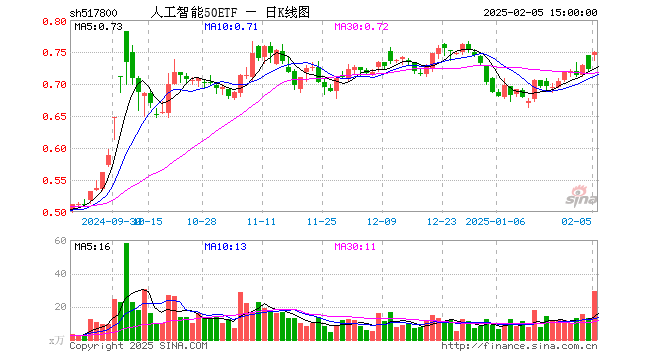 2月5日,人工智能50ETF(517800)涨3.88%,成交额2181.08万元。当日份额增加800.00万份,最新份额为2.45亿份,近20个交易日份额增加1900.00万份。最新资产净值计算值为1.84亿元。