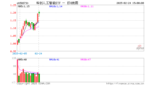 2月24日,科创人工智能ETF(588730)涨0.08%,成交额4985.08万元。当日份额增加800.00万份,最新份额为1.69亿份。最新资产净值计算值为2.02亿元。