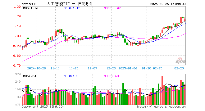 2月25日,人工智能ETF(515980)跌1.27%,成交额2.46亿元。当日份额增加3500.00万份,最新份额为21.95亿份,近20个交易日份额增加1.64亿份。最新资产净值计算值为25.55亿元。