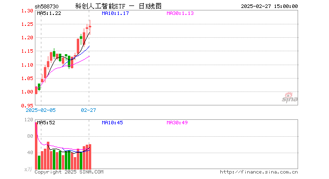 2月27日,科创人工智能ETF(588730)涨0.40%,成交额7431.26万元。当日份额增加1300.00万份,最新份额为2.06亿份。最新资产净值计算值为2.56亿元。