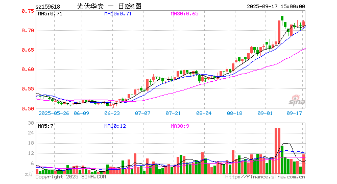 9月17日,光伏ETF指数基金(159618)涨1.41%,成交额814.56万元。当日份额减少300.00万份,最新份额为9413.14万份,近20个交易日份额减少700.00万份。最新资产净值计算值为6790.64万元。