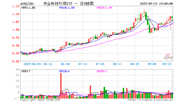 9月23日,央企科技引领ETF(562380)跌0.83%,成交额840.72万元。当日份额减少50.00万份,最新份额为9612.89万份,近20个交易日份额减少1350.00万份。最新资产净值计算值为1.03亿元。