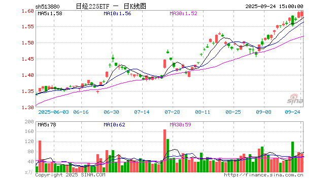 9月24日,日经225ETF(513880)涨0.13%,成交额1.12亿元。当日份额增加800.00万份,最新份额为11.14亿份,近20个交易日份额增加5900.00万份。最新资产净值计算值为17.56亿元。