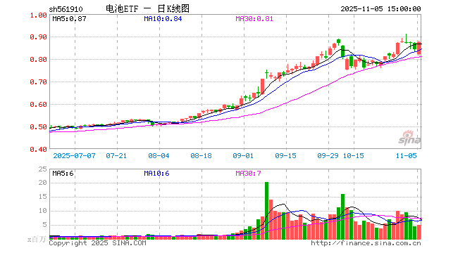 11月5日,电池ETF(561910)涨3.80%,成交额4.27亿元。当日份额增加4600.00万份,最新份额为69.74亿份,近20个交易日份额增加4.81亿份。最新资产净值计算值为60.97亿元。
